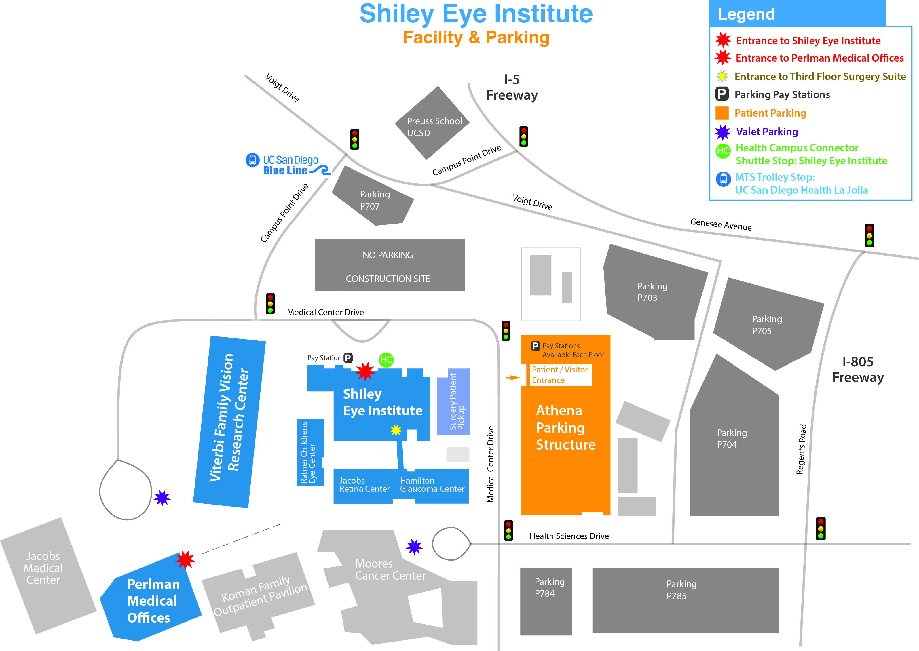 Exit Genesee Avenue and head east (away from the ocean). Continue through several traffic lights and turn right onto Regents Road. Make a right onto Health Sciences Drive. Make a right onto medical center drive at the stop sign. Continue onto medical center drive. The Athena Parking Structure (patient parking) is located on your right. If you keep driving, the Shiley Eye Institute will be on your left.